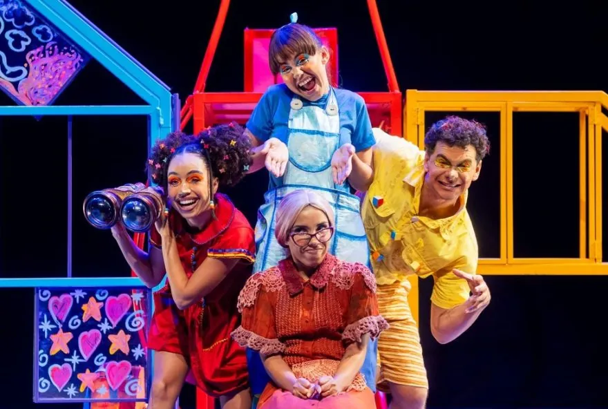 E não é só sentar na poltrona e assistir, não. A diversão começa antes mesmo do espetáculo: a partir das 15h, o saguão vira um grande parque com corda, elástico, bambolê, amarelinha, peteca, perna de pau e outras brincadeiras que aquecem o público para o que vem no palco.