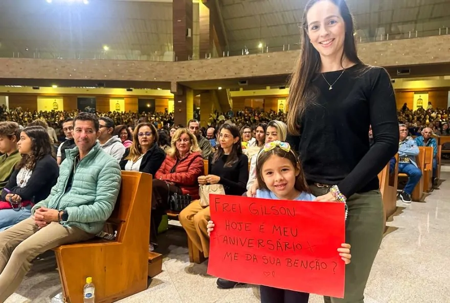 Carina e a filha Cecília, de seis anos, chegaram ao santuário da Canção Nova por volta das 3h30 da madrugada da última quinta-feira (17). Caminhando em direção aos bancos mais próximos do altar, carregavam um cartaz com os dizeres: “Frei Gilson, hoje é meu aniversário. Me dá sua benção?”.