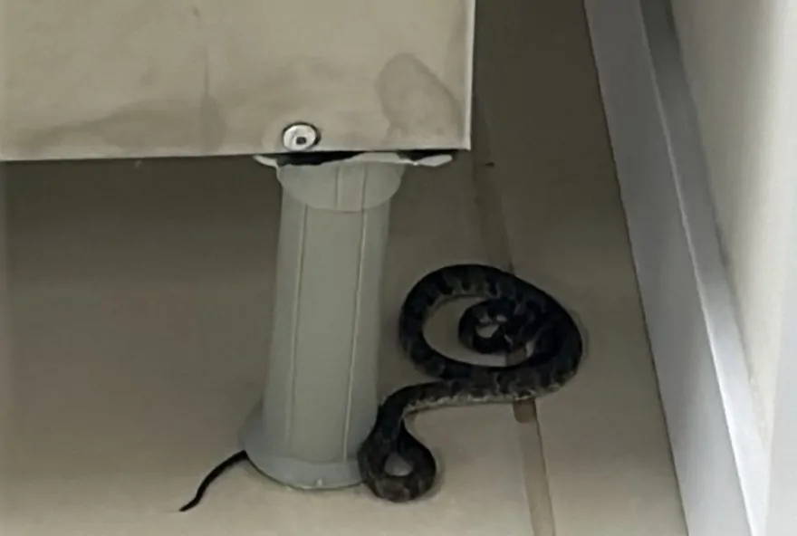Um filhote de jararaca, cobra peçonhenta, foi encontrado embaixo do bebedouro de