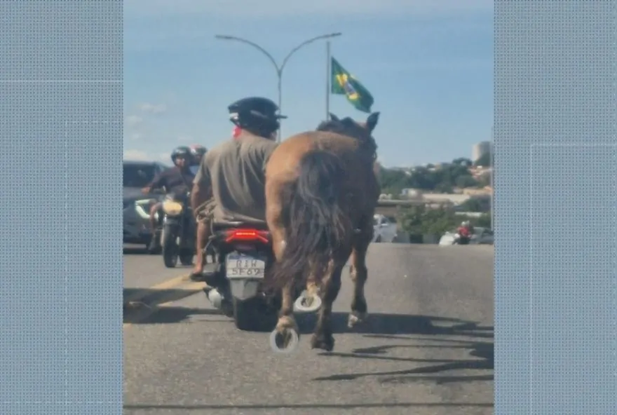 Um homem foi flagrado conduzindo um cavalo por meio de uma corda enquanto seguia como garupa em uma moto no Viaduto Padre João Musch, na Via Light, em Nova Iguaçu, na Baixada Fluminense. As imagens mostram o animal sendo guiado pelo homem enquanto o motociclista segue em velocidade moderada pelo viaduto. A Secretaria Municipal de Mobilidade Urbana informou que não recebeu nenhuma denúncia formal sobre o caso, mas repudia esse tipo de conduta por colocar em risco a segurança de todos no trânsito. O órgão afirmou que tem intensificado as ações de fiscalização nas ruas da cidade para coibir práticas irresponsáveis como essa.