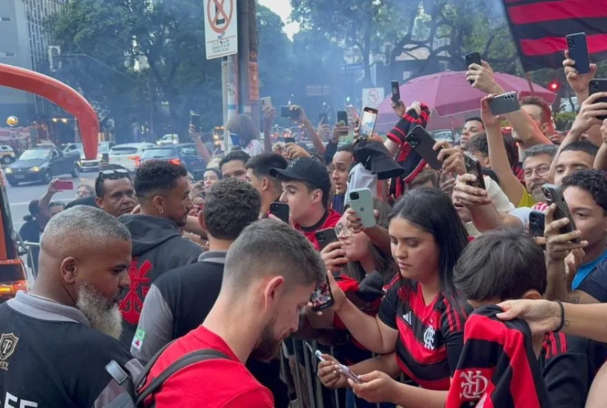 O clube de futebol Flamengo chegou a Belo Horizonte na noite desta segunda-feira para o aguardado confronto com o Atlético-MG, válido pelo Campeonato Brasileiro. Com a maior parte do elenco disponível, a delegação foi recebida com entusiasmo na véspera da partida que tem potencial para definir o título da competição. A presença de cerca de 50 torcedores foi marcante, recepcionando os jogadores no hotel da cidade. Alguns dos atletas, como Saul, Jorginho, Danilo, Luiz Araújo e Léo Pereira, pararam para interagir com a torcida, posando para fotos e distribuindo autógrafos.