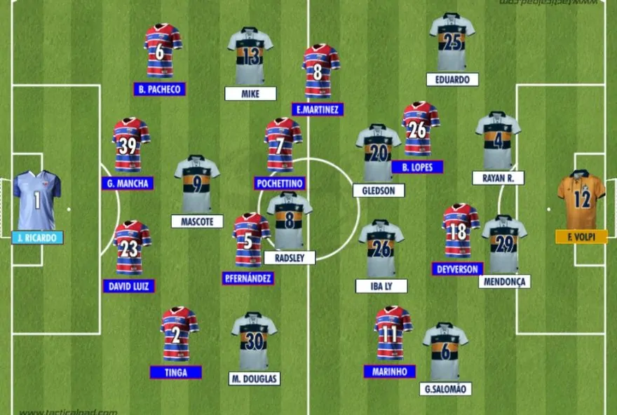 Juan Pablo Vojvoda não teve Kuscevic e Matheus Rossetto. David Luiz voltou a ter chance na zaga e Pol Fernandez fez dupla de volantes com Pochettino. Emmanuel Martinez partiu do lado esquerdo do meio-campo. Tinga foi o lateral-direito e Eros Mancuso começou no banco. Marinho e Deyverson iniciaram a partida. Pikachu e Lucero esperaram.