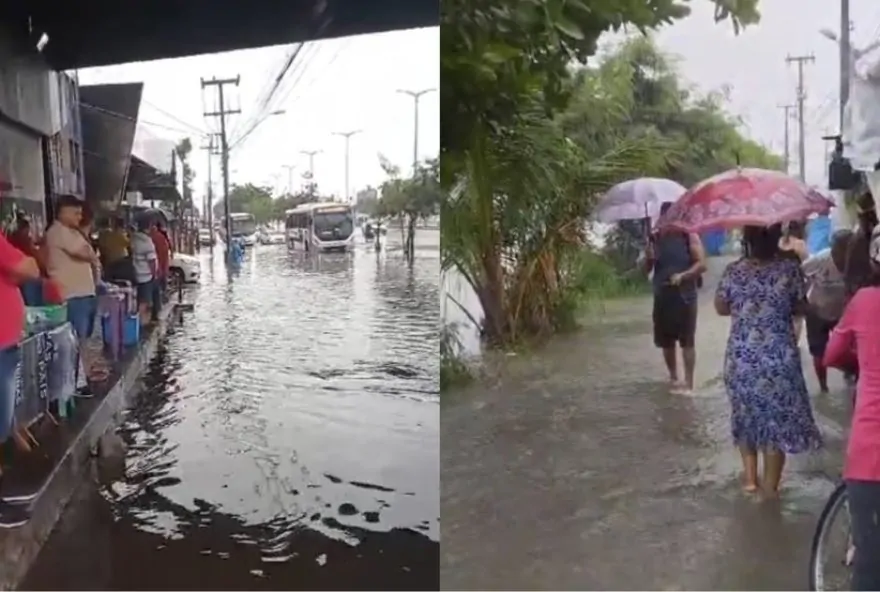 Desde a noite da última sexta-feira, as fortes chuvas têm atingido Fortaleza, resultando em diversos pontos de alagamento em vários locais da cidade. Imagens feitas por moradores e trabalhadores mostram a dimensão do problema, com ruas submersas e a dificuldade de locomoção tanto para pedestres quanto para veículos.