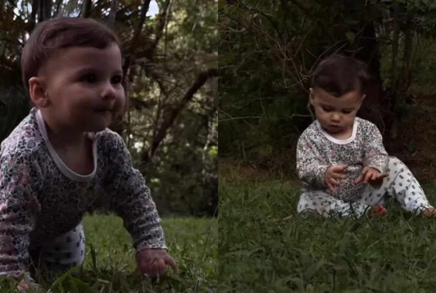 A modelo Amanda Kimberlly, 29 anos, divulgou novas imagens da filha Helena, que completou nove meses recentemente, fruto de seu relacionamento com o jogador Neymar. Nas fotos, a pequena Helena aparece se divertindo ao ar livre, brincando em meio à natureza. Em uma das cenas compartilhadas, a garotinha se diverte em uma brincadeira que lembra um carrinho de mão, improvisada com o uso de um pedaço de papelão.