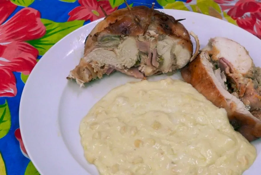 Aprenda a fazer um frango desossado e recheado ao molho de milho verde
