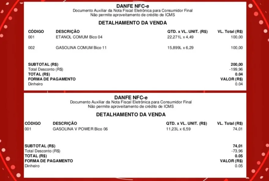 De acordo com o delegado Derick Moura Jorge, o suspeito registrava descontos falsos de até 99% nas notas fiscais. Ele fazia isso se aproveitando da posição de confiança e do acesso que tinha ao sistema interno de vendas e emissão de notas fiscais, já que desempenhava as funções de atendente, caixa e emissor de notas fiscais do posto, explica.