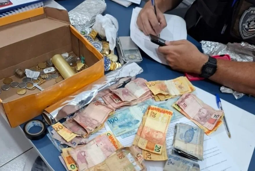 objetos utilizados para o tráfico de drogas, dinheiro e dispositivos