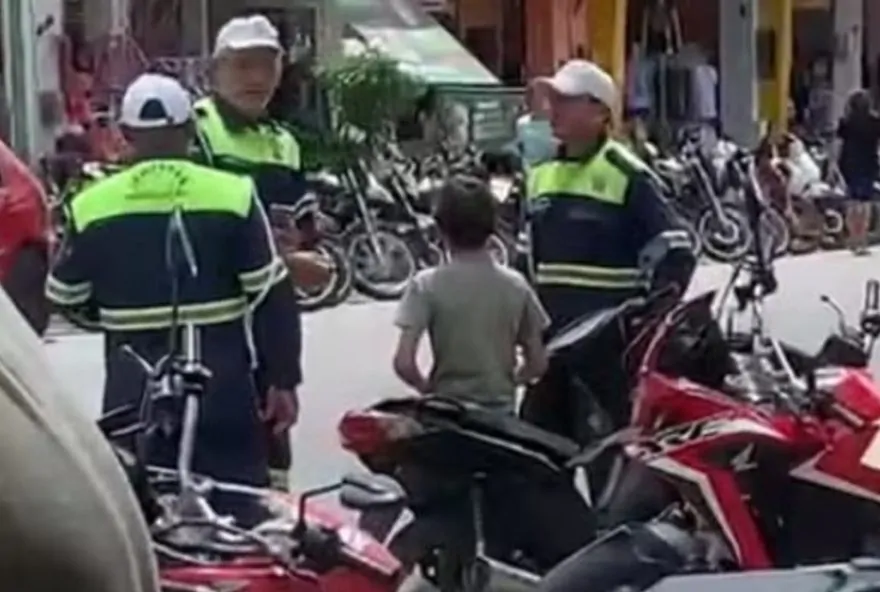 Uma testemunha gravou o momento que os agentes abordaram a criança, que já estava com a moto estacionada em frente a um comércio.