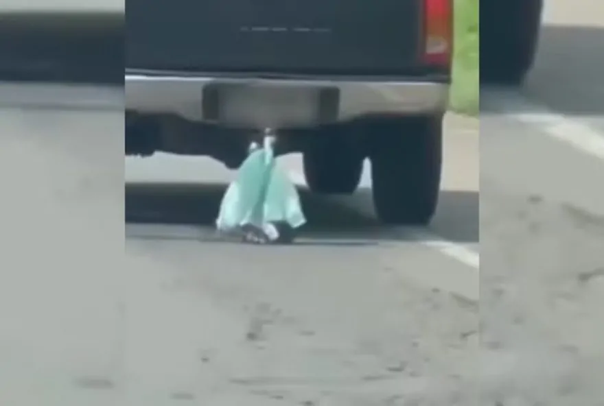 Motoristas que trafegavam pela GO-070, em Goianira, flagraram uma caminhonete arrastando um gato pelo engate do veículo. O animal estava dentro de uma sacola de plástico e, segundo o motorista, o bicho havia morrido horas antes.