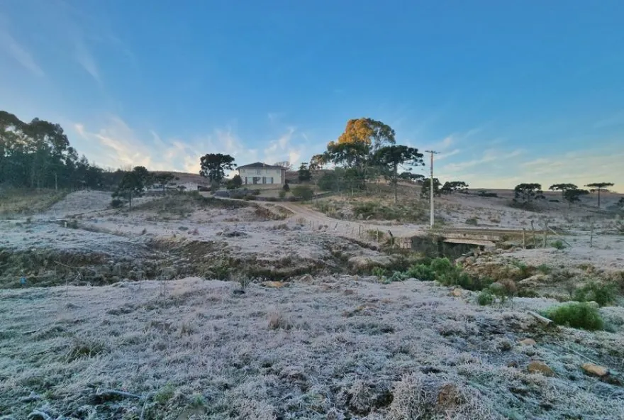 A geada cobriu de branco campos na Serra de Santa Catarina no amanhecer deste domingo (6). Foram registradas temperaturas negativas, com uma mínima de -4,3°C em São Joaquim, segundo estação do Instituto Nacional de Meteorologia (Inmet).