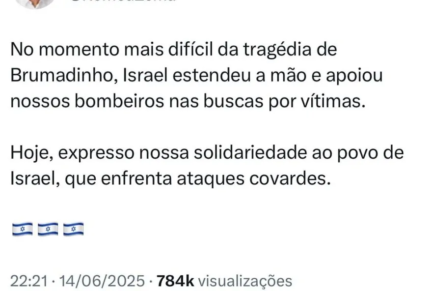 Zema classificou os ataques realizados pelo Irã como “covardes” e fez menção ao auxílio prestado por militares israelenses durante as buscas por vítimas do rompimento da barragem de Brumadinho em 2019. Em sua publicação, o governador destacou a importância da solidariedade entre as nações em tempos difíceis.