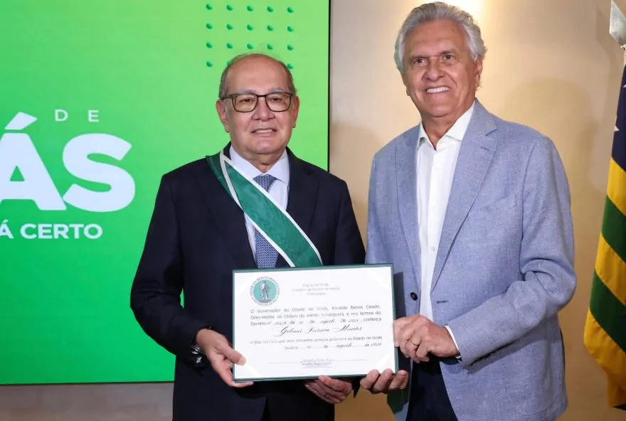 O governador Ronaldo Caiado entregou, neste sábado (17/08), a Comenda da Ordem do Mérito Anhanguera ao ministro do Supremo Tribunal Federal (STF), Gilmar Mendes, no Palácio das Esmeraldas, em Goiânia. A honraria é a mais importante concedida pelo Estado. Criada em 1975, ela prestigia autoridades, personalidades e corporações que se destacam por serviços e ações relevantes para Goiás.