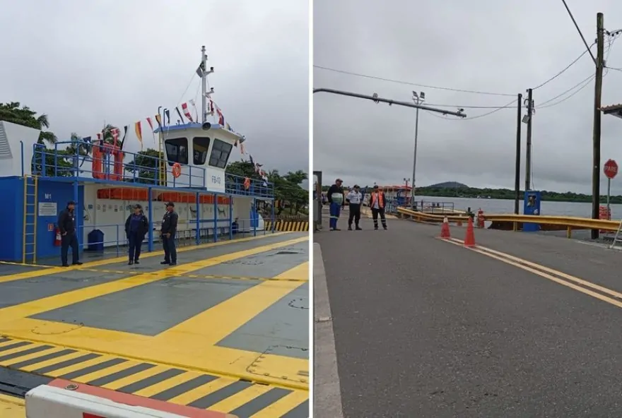 1 de 1 Governo de São Paulo entrega balsa (à esq.) e realiza vistoria (à dir.) em travessia no litoral de São Paulo — Foto: Dione Aguiar/TV Tribuna