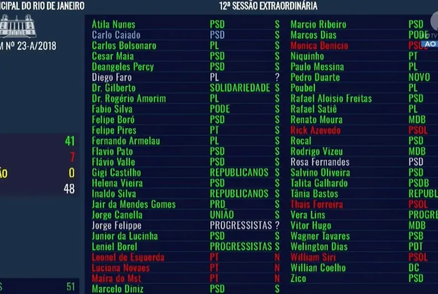 Projeto é aprovado na Câmara do Rio por 43 a 7, os votos dos vereadores Diego Faro (PL) e Jorge Felippe (Progressistas) foram computados, mas não apareceram no painel. — Foto: Reprodução TV Câmara