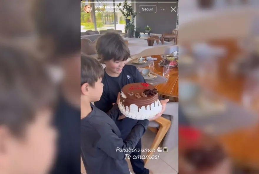 O cantor Gusttavo Lima comemorou o aniversário de 36 anos nesta quarta-feira (3) ao lado da família. Nos stories do Instagram, sua esposa, a modelo Andressa Suita, mostrou os filhos, Gabriel e Samuel, surpreendendo o pai com um bolo de chocolate.