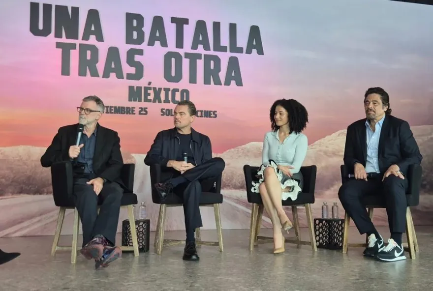 Paul Thomas Anderson, Leonardo DiCaprio, Chase Infiniti e Benicio del Toro em coletiva de imprensa de ‘Uma batalha após a outra’ no México — Foto: Cesar Soto/de