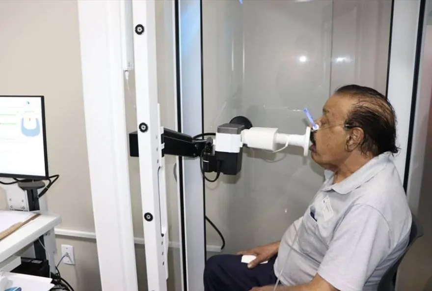 A médica pneumologista da unidade, Lorena Barbosa explica que a pletismografia é um teste de função pulmonar, usado para avaliar os volumes pulmonares de uma forma mais detalhada que a espirometria.