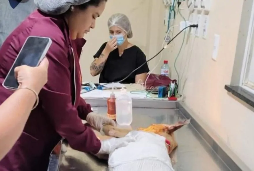 O cãozinho está com diversas escoriações e ferimentos graves. A equipe de veterinários está tentando estabilizar a febre do pet, que ficará em observação para posterior decisão acerca do melhor tratamento a ele.