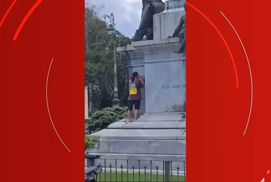Homem é flagrado pichando monumento histórico na Praça da República, em Belém [https://s02.video.glbimg.com/x240/13719457.jpg]