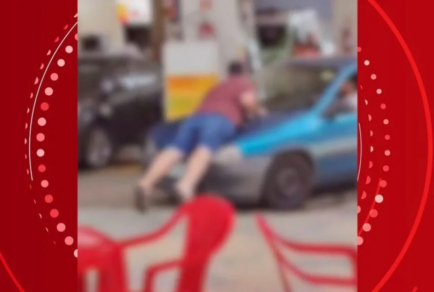 O motorista do veículo azul ainda parou por alguns segundos, mas arrancou novamente com o homem em cima dele. No caminho, bateu o automóvel na lateral de outro carro que estava próximo.