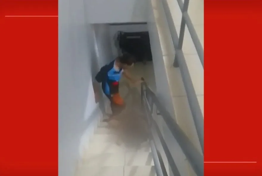 mostram vítima caída na escada e sendo agredida; ‘vou te matar’, diz o agressor.