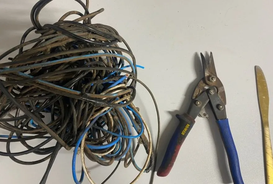 Na mochila apreendida, havia uma faca de cozinha e um alicate. Segundo a PM, cerca de dois quilos de fios elétricos já haviam sido cortados.