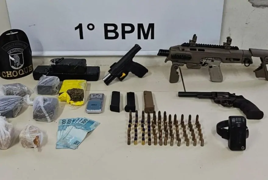 No local, foram encontradas duas pistolas de calibre 9 mm, um revólver, um kit roni, munições, mais de dois kg de maconha e quase 400 gramas de crack, diz a PM.