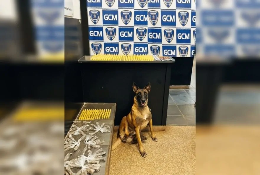 A GCM solicitou apoio do canil para averiguar a suspeita, e o cão farejador ‘Akila’ identificou uma sacola próxima a um córrego contendo 501 pinos de cocaína, 197 porções de maconha, 128 porções de crack e 25 de skank.