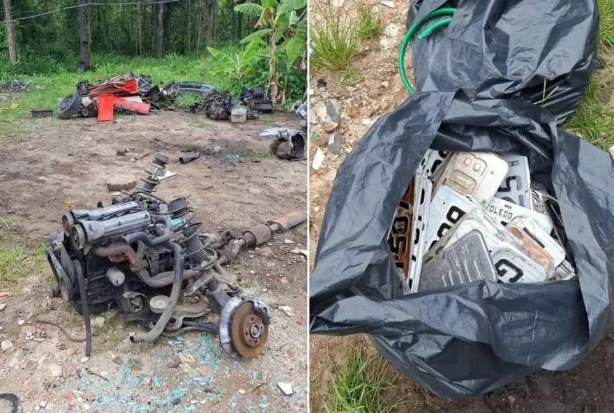 Seguindo o condutor, os policiais chegaram a um terreno na Avenida Ribeirão Preto, onde funcionava o desmanche clandestino. No local, foram encontradas diversas peças de veículos, como motores, portas, faróis e suspensão.