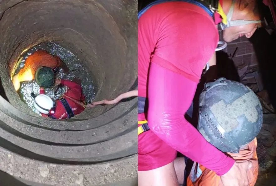 Ao chegarem ao local, os bombeiros montaram uma estrutura com tripé e equipamentos de corda para conseguir acessar a vítima com segurança, já que se tratava de um espaço confinado e de difícil acesso. Então, um agente desceu até o interior do poço para prestar os primeiros atendimentos. Segundo a equipe, a vítima estava consciente e orientada, mas apresentava suspeita de fratura no braço esquerdo e no tornozelo direito, além de escoriações nos dois joelhos, possível lesão na região lombar e sinais de hipotermia.