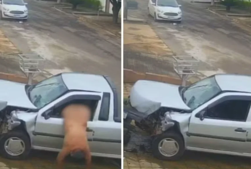 Um homem de 47 anos foi filmado fugindo pelado após roubar um carro e bater contra o muro de uma casa em Anápolis, a 55 km de Goiânia. As imagens, capturadas por câmeras de segurança, mostram o momento do acidente e a subsequente fuga do homem.