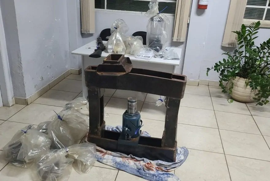 Os policiais também apreenderam um liquidificador, duas balanças medidoras, um caderno com anotações, uma panela, duas peneiras, um abridor de madeira, duas colheres, três facas, um medidor, três espátulas, um pedaço de madeira com pregos e dinheiro.