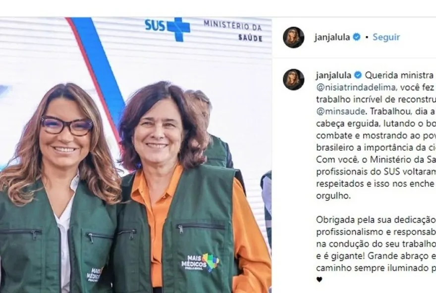 No post, Janja destacou a dedicação e competência de Nísia Trindade durante o