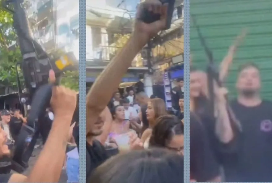 Nas imagens é possível ver um homem de pistola e dois homens armados com fuzis. Todos exibem suas armas durante o jogo, ao lado dos moradores e comerciantes do local.