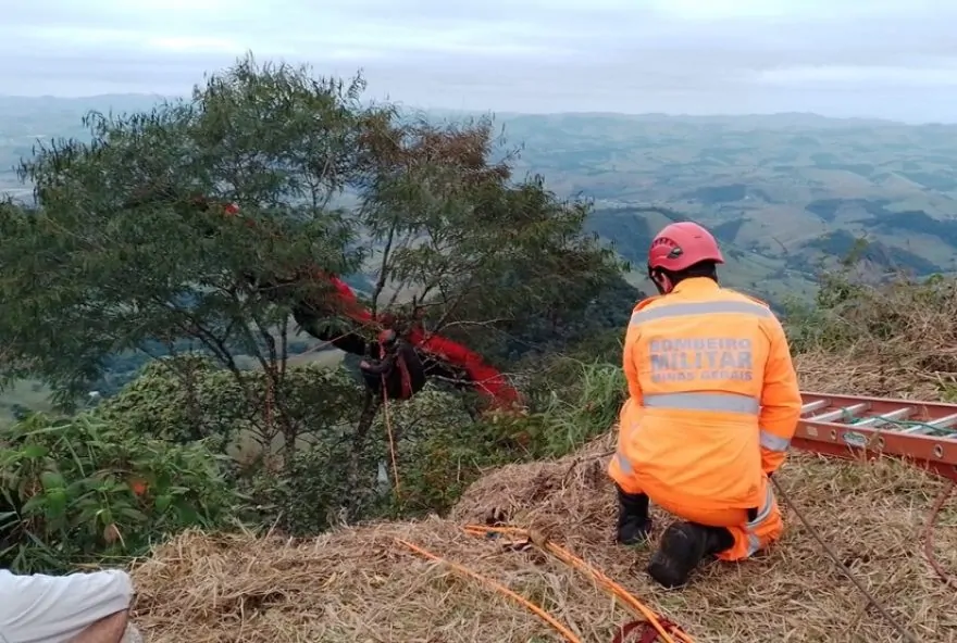 Dois homens, um de 28 e outro de 41 anos, passaram por apuros ao ficarem presos na copa de uma árvore após a decolagem de um parapente no distrito de Pirapanema, em Muriaé. A ocorrência aconteceu na tarde deste sábado (7), em uma região conhecida por sediar um festival de gastronomia e voo livre. Segundo informações do Corpo de Bombeiros, o acidente ocorreu próximo à rampa de decolagem, e as vítimas ficaram retidas em uma árvore logo abaixo da área de voo.