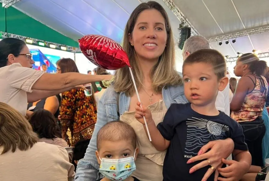 Morgana, o filho Olavo, de 5 anos, que faz tratamento contra o câncer no Cora, e o outro filho — Foto: Catarina Lima/ O Popular