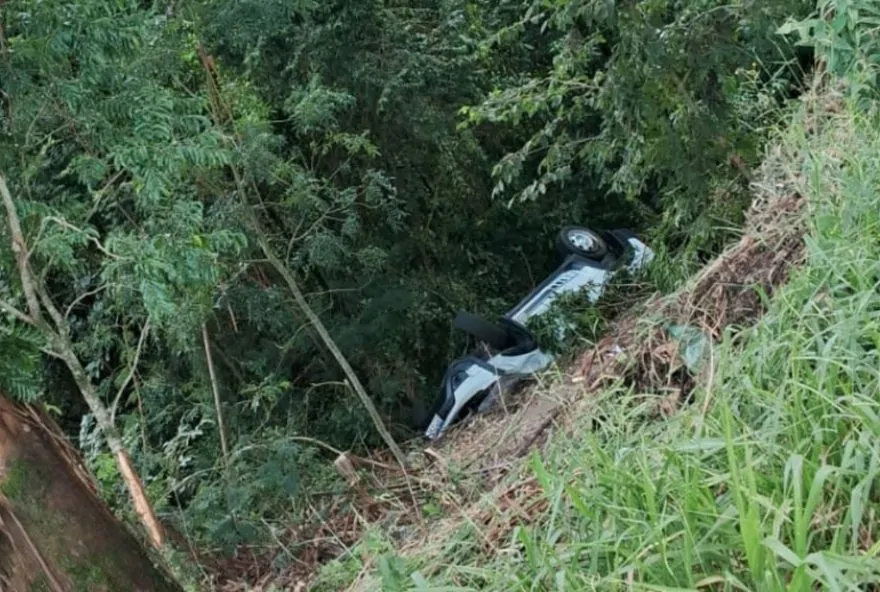 Após uma denúncia, a PM foi até o trecho de área rural e encontrou o veículo às margens da rodovia, em meio à vegetação, com as quatro rodas para cima.