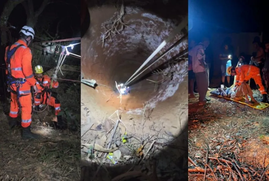 Um idoso de 73 anos foi resgatado pelo Corpo de Bombeiros após cair em uma cisterna desativada de aproximadamente oito metros de profundidade, no bairro Boa Vista, em Caetanópolis, na Região Central de Minas Gerais. A operação de resgate teve início no fim da noite de sábado (11). Durante a queda, o idoso sofreu ferimentos na cabeça e apresentava fortes dores na coluna, porém, estava consciente e orientado no momento em que foi encontrado pelos bombeiros.