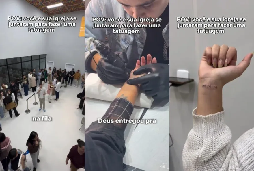 Uma igreja em Balneário Camboriú, no Litoral Norte de Santa Catarina, promoveu uma sessão de tatuagem coletiva entre os fiéis. O vídeo publicado pelo pastor Eduardo Reis viralizou na web e mostra jovens formando fila, na sede da Reino Church, para tatuar versículos bíblicos. As tatuagens foram feitas no formato lettering, estilo que destaca letras e palavras, geralmente com fontes artísticas ou caligrafadas. No vídeo, os fiéis aparecem gravando na pele “Mateus 24:14”, que fala sobre pregar o evangelho no mundo todo.