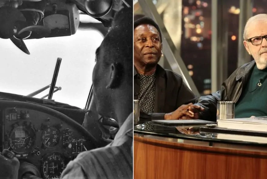 1 de 15 Pelé ‘piloto’ de avião (à esq.) e durante entrevista a Jô Soares (à dir.) — Foto: Arquivo/A Tribuna Jornal