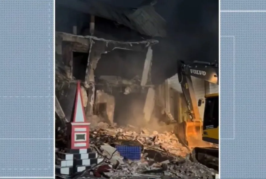 Supermercado destruído por incêndio na divisa entre DE e PE tem estrutura demolida após colapso