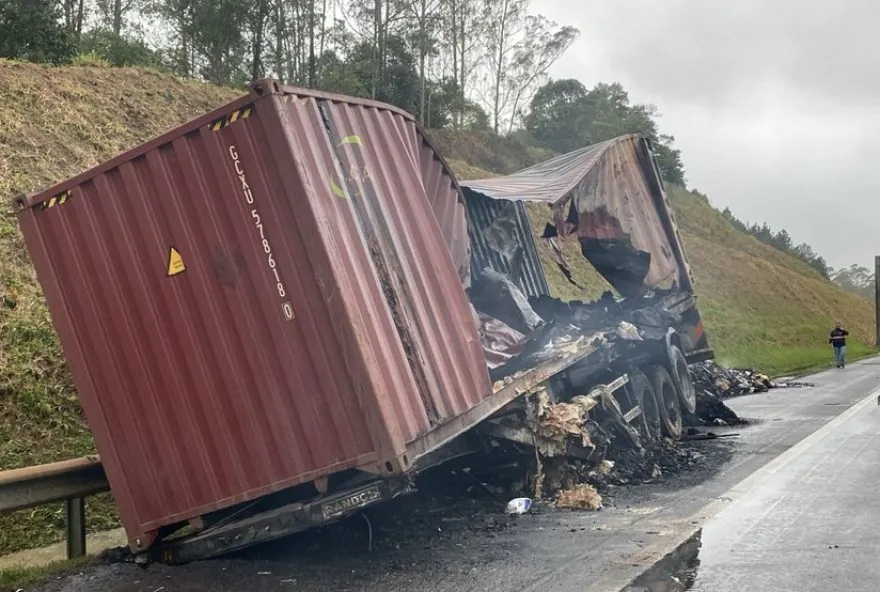 Parte da carga do caminhão ficou em chamas durante as 12 horas de incêndio, causando congestionamentos significativos, especialmente durante a tarde, quando a pista interditada e a chuva tornaram a situação ainda mais complicada para os motoristas.