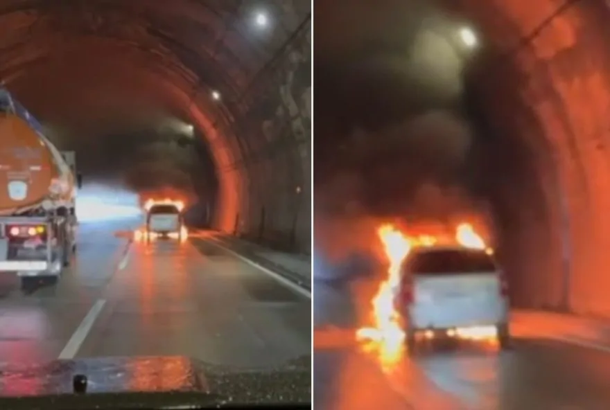 Um veículo foi completamente destruído por um incêndio, na manhã desta quinta-feira (26), dentro de um túnel da Rodovia dos Imigrantes, em São Vicente, no litoral de São Paulo. De acordo com a Ecovias, concessionária responsável pela rodovia, o carro foi abandonado no local.