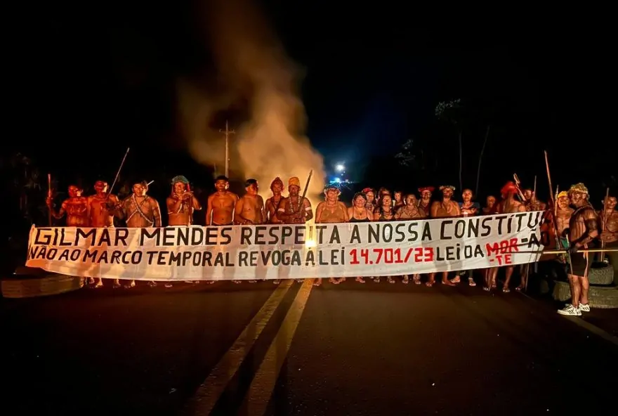 A mobilização dos indígenas iniciou por volta das 3h da madrugada. Eles estenderam uma faixa na rodovia com um apelo ao ministro Gilmar Mendes, que propôs a criação da Câmara de Conciliação.