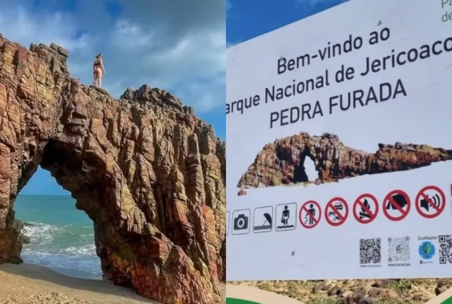 Apesar de a influenciadora dizer que não existe sinalização, há uma placa próximo à Pedra Furada alertando que é proibido subir no monumento (veja acima). De acordo com o Parque Nacional de Jericoacoara, somente é possível tirar fotos do monumento. “Não jogue lixo, preserve a natureza!”, avisa a administração.