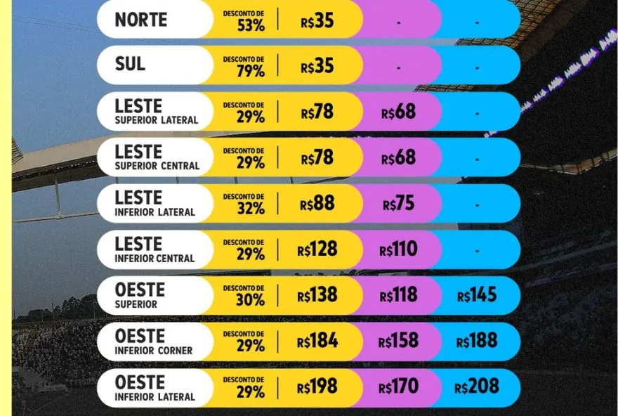 Confira os valores dos ingressos para o jogo: Norte – R$ 75,00; Sul – R$ 170,00; Leste Superior Lateral – R$ 110,00; Leste Superior Central – R$ 110,00; Leste Inferior Lateral – R$ 130,00; Leste Inferior Central – R$ 180,00; Oeste Superior – R$ 198,00; Oeste Inferior Corner – R$ 260,00; Oeste Inferior Lateral – R$ 280,00.