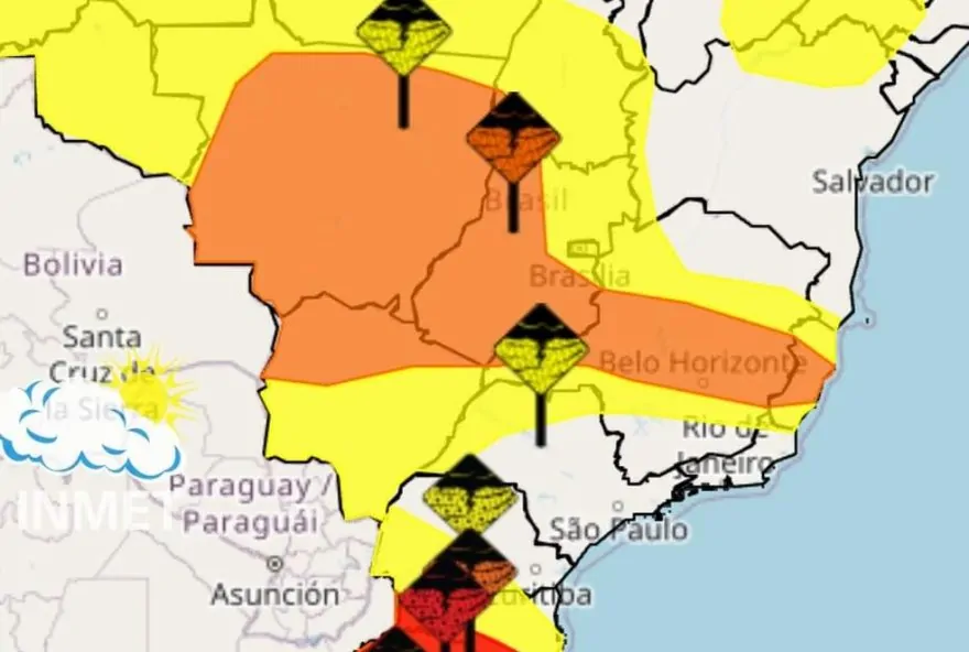 A previsão do Instituto Nacional de Meteorologia (INMET) para as próximas 24 horas, das 9h deste domingo às 10h de segunda-feira, indica que as chuvas podem variar entre 30 e 60 milímetros, podendo chegar até 100 mm por dia, acompanhadas de ventos entre 60 e 100 km/h.