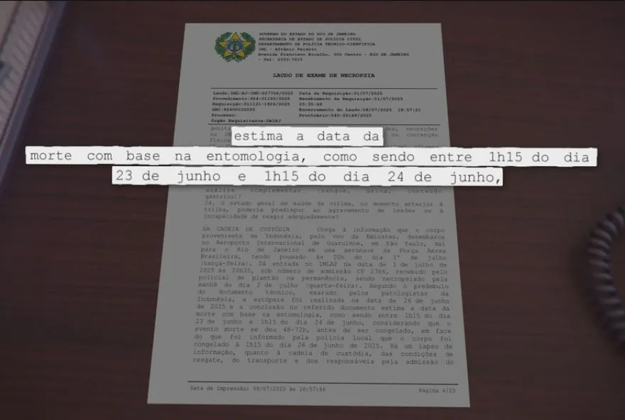 O documento elaborado pela perícia brasileira ressaltou que a causa imediata do óbito foi hemorragia interna resultante de lesões poliviscerais e politraumatismo, coerentes com um forte impacto. Não foi possível determinar com precisão o horário exato da morte devido ao estado embalsamado do corpo, o que prejudicou a análise de indicadores como temperatura corporal e rigidez cadavérica. Um laudo da Polícia Civil do Rio de Janeiro apresentou detalhes do primeiro exame realizado na Indonésia, sugerindo que o acidente ocorreu entre a madrugada do dia 23 e do dia 24 de junho.