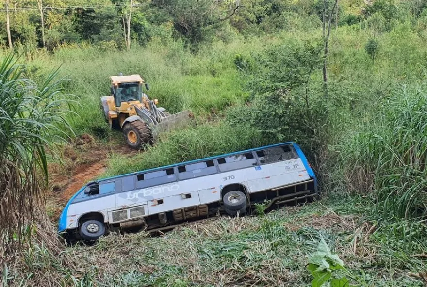 Micro-ônibus do transporte público de Juiz de Fora caiu em barranco — Foto: Marcus Pena/TV Integração