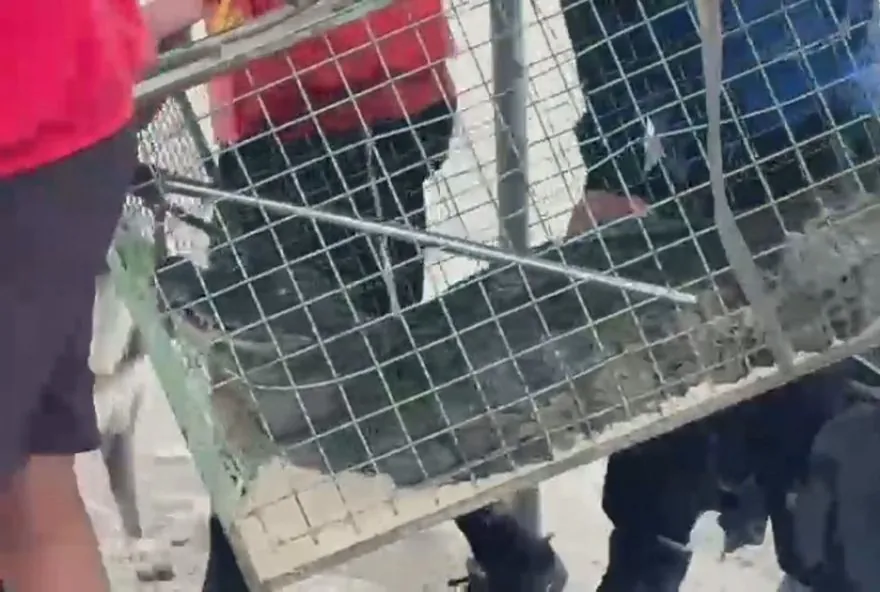 O jacaré foi colocado em uma espécie de gaiola e, devido ao seu tamanho, foram